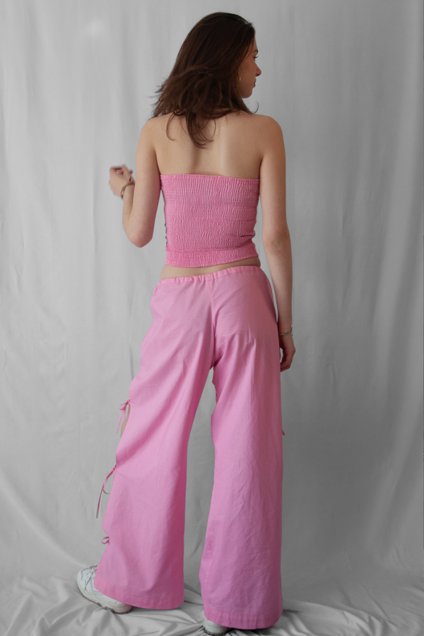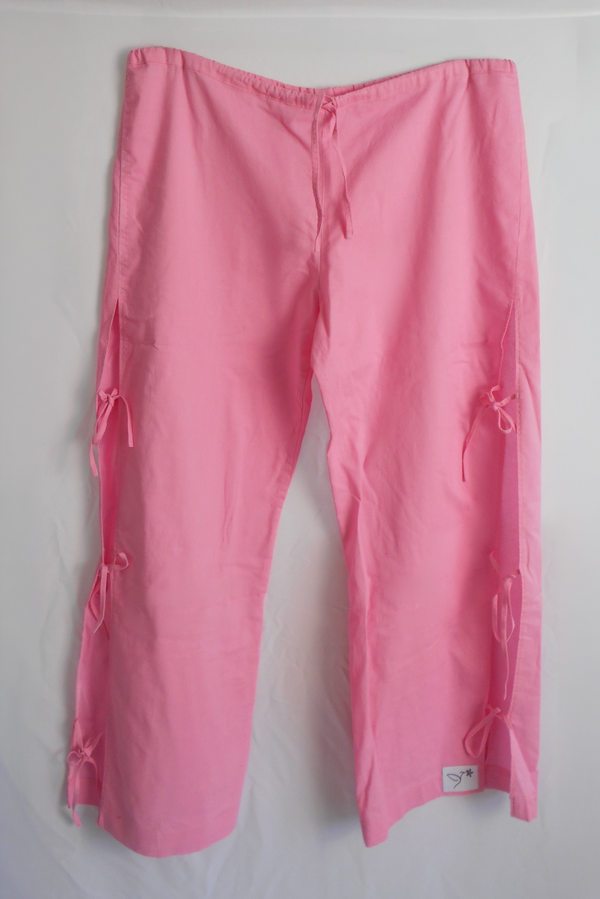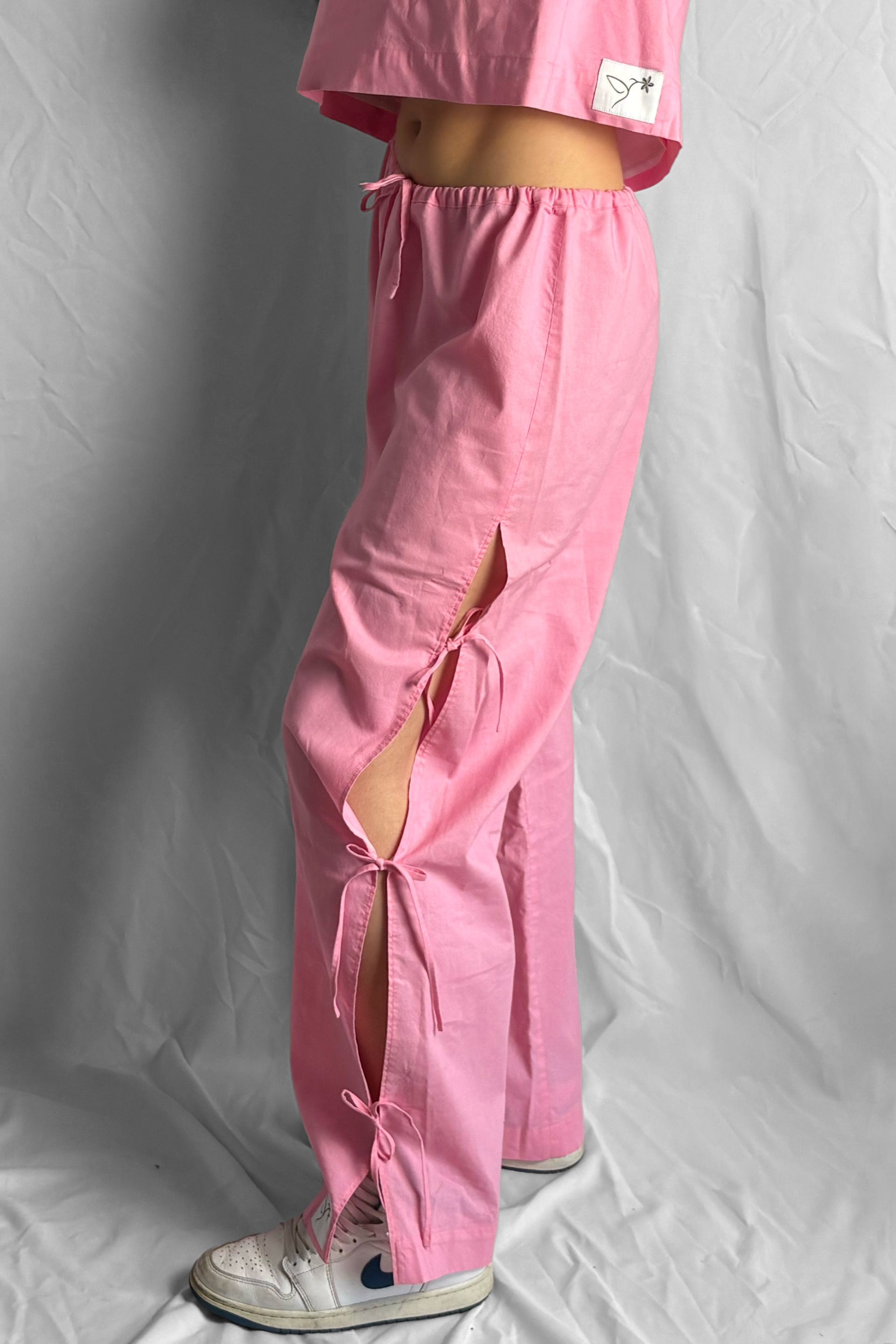 Wide-fit, 100% cotton pant. With an adjustable waistband and slits on the side, with cute bows in between.